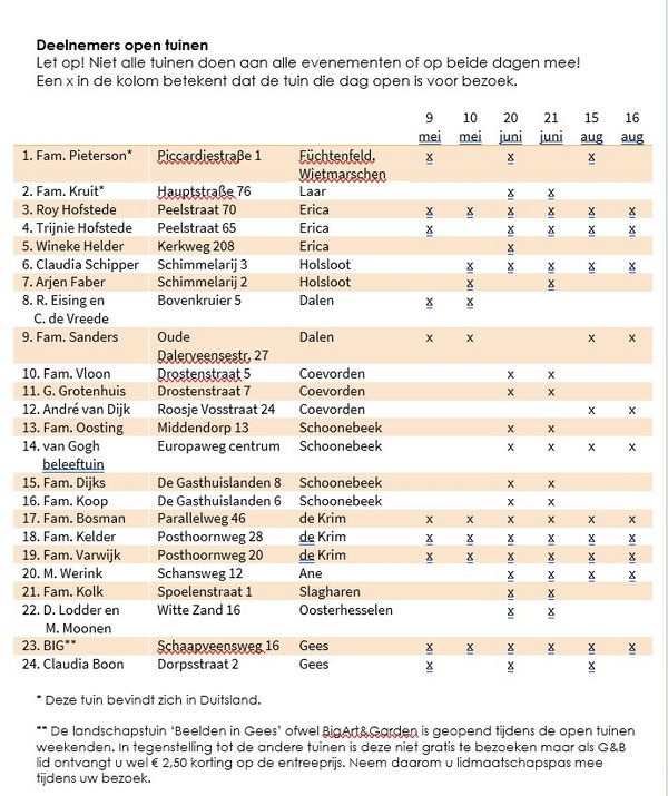 In mei (tijdens het Voorjaarstuinenweekend) en in juni (tijdens het Landelijke Open Tuinen Weekend) openen alle afdelingen hun tuinen.