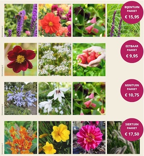 3: Eetbaar pakket Van € 11,00 voor € 9,95 Een mooie én smakelijke combinatie voor de tuin: bloemen, kruiden en fruit in één pakket. De bloemblaadjes van de dieprode dahlia smaken licht peperig, met een vleugje chocolade. Knoflookbieslook geeft de hele zomer een subtiele smaak, en de aardbeien zorgen voor een zoete oogst. Zo verbind je sierwaarde en eetplezier moeiteloos met elkaar.